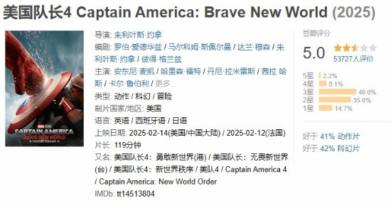 影片豆瓣评分5.0分,仅2.2%的玩家给出5星评价。
